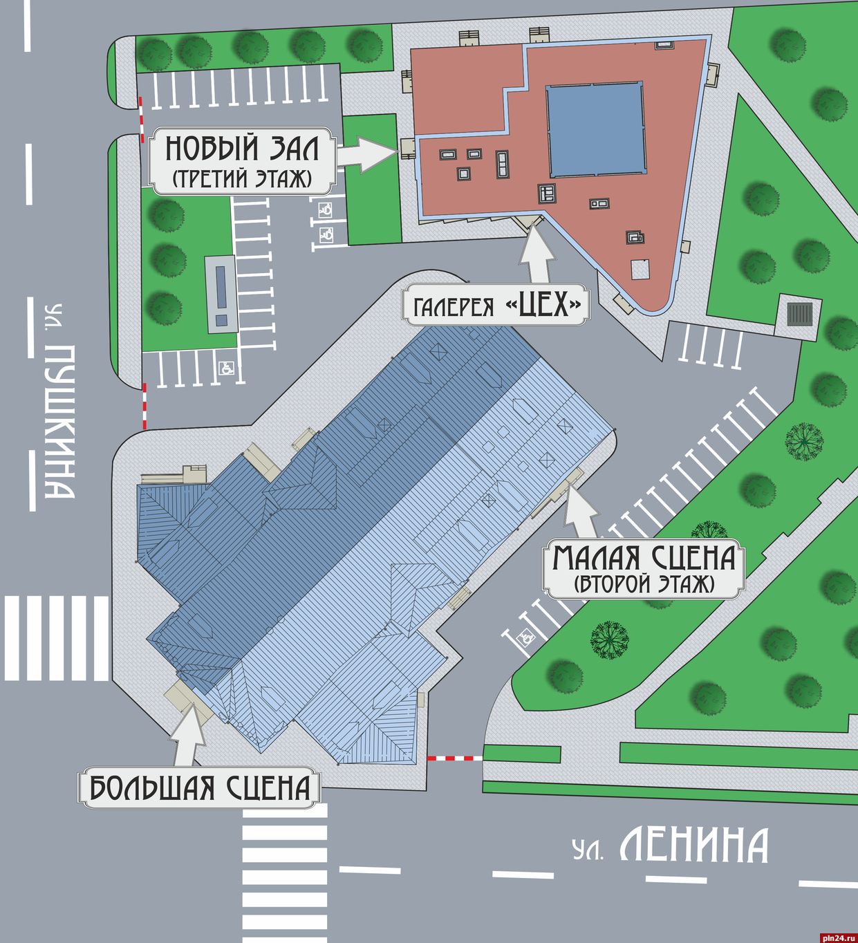 Новый зал располагается во втором здании театра на третьем этаже, вход с улицы Пушкина.