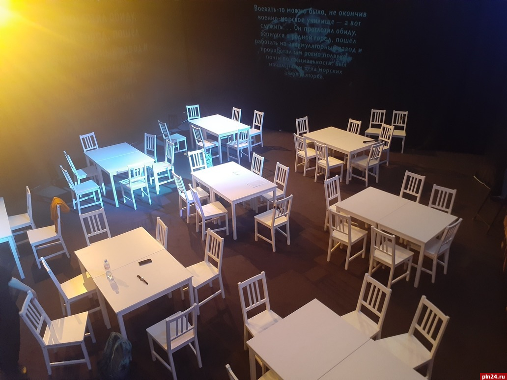 «Для спектакля “Дни Победы” мы придумали новое пространство. Это не большая и не малая сцена, это медиахолл, из которого театр сделал еще одно пространство. Мы с художником придумали такую сценографию, при которой зрители и актеры сидят вместе за столами (как будто в кафе), и нет разделения на сцену и зрительный зал», - рассказала режиссер Вера Попова.