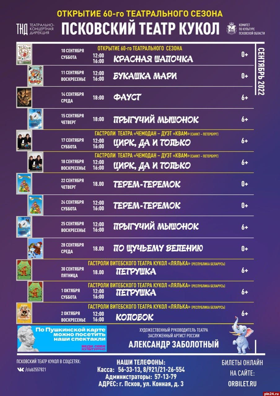 Афишу Псковского областного театра кукол на сентябрь опубликовали в телеграм-канале Театрально-концертной дирекции Псковской области.