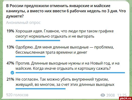 Подтверждением тому служат результаты опроса в Telegram-канале Псковской Ленты Новостей, в котором приняли участие 920 респондентов. 47% опрошенных поддержали вариант «Длинные выходные нужны и на Новый год, и на майские. Когда иначе отдыхать и картошку сажать?»