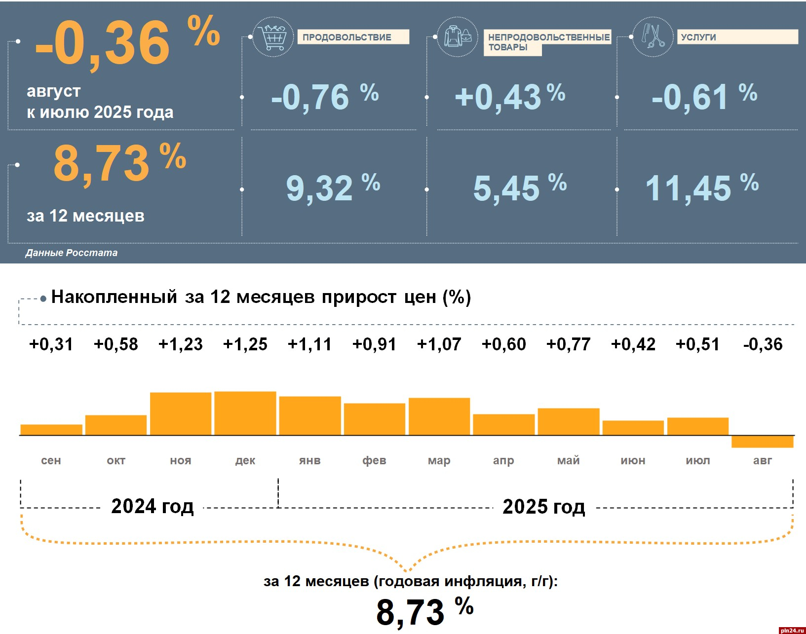 Цены в Псковской области в августе 2025 года, по данным Росстата, снизились на 0,36% к июлю. Годовая инфляция замедляется третий месяц подряд, и в августе она составила 8,73%. Это выше, чем в целом по стране (8,14%), сообщили Псковской Ленте Новостей в отделении по Псковской области Северо-Западного главного управления Центрального банка Российской Федерации.