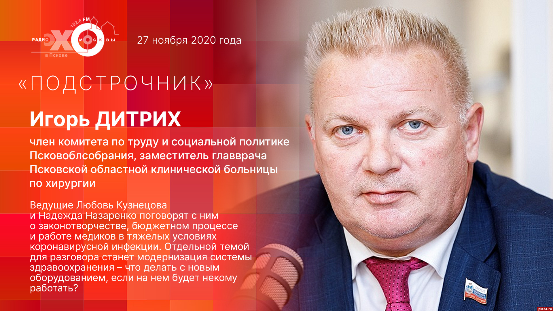 Предлагаем вашему вниманию видеотрансляцию программы «Подстрочник», которая в эти минуты начинается в прямом эфире радио «Эхо Москвы» в Пскове (102 FM). Гость студии – депутат Псковского областного Собрания, заместитель главного врача Псковской областной больницы по хирургии, региональный координатор партпроекта «Единой России» «Здоровое будущее» Игорь Дитрих.