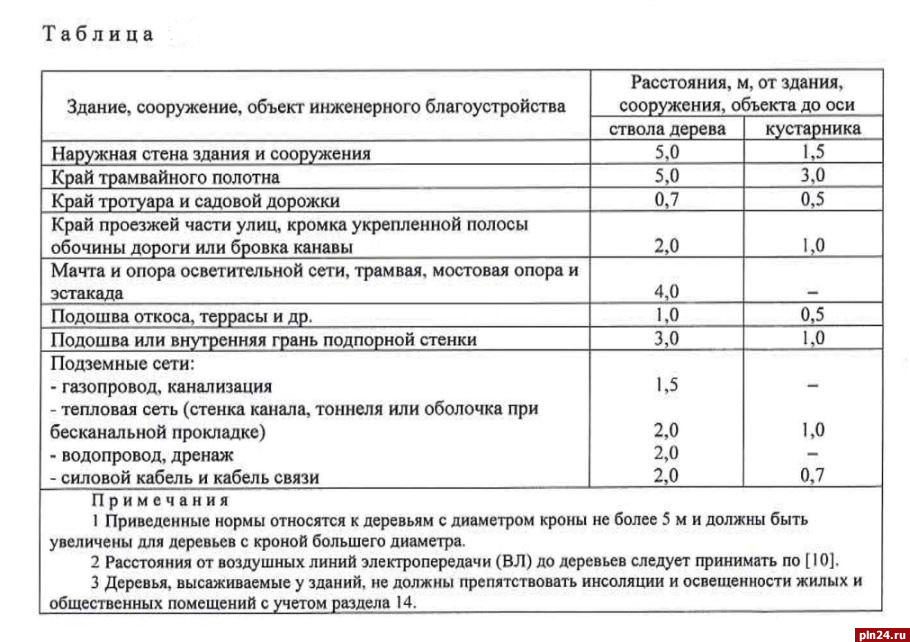 Согласно действующим СНиП, между дорожным полотном и деревьями должно быть не меньше двух метров. Примерно на таком же расстоянии они должны находиться и от инженерных коммуникаций: от теплосетей, водопровода и кабелей связи их должно отделять не менее 2 метров и не менее полутора - от газопровода и канализации (см. таблицу) Также важно и расстояние до зданий и сооружений, оно должно составлять не менее 5 метров, и не менее 4 метров - от опор освещения.