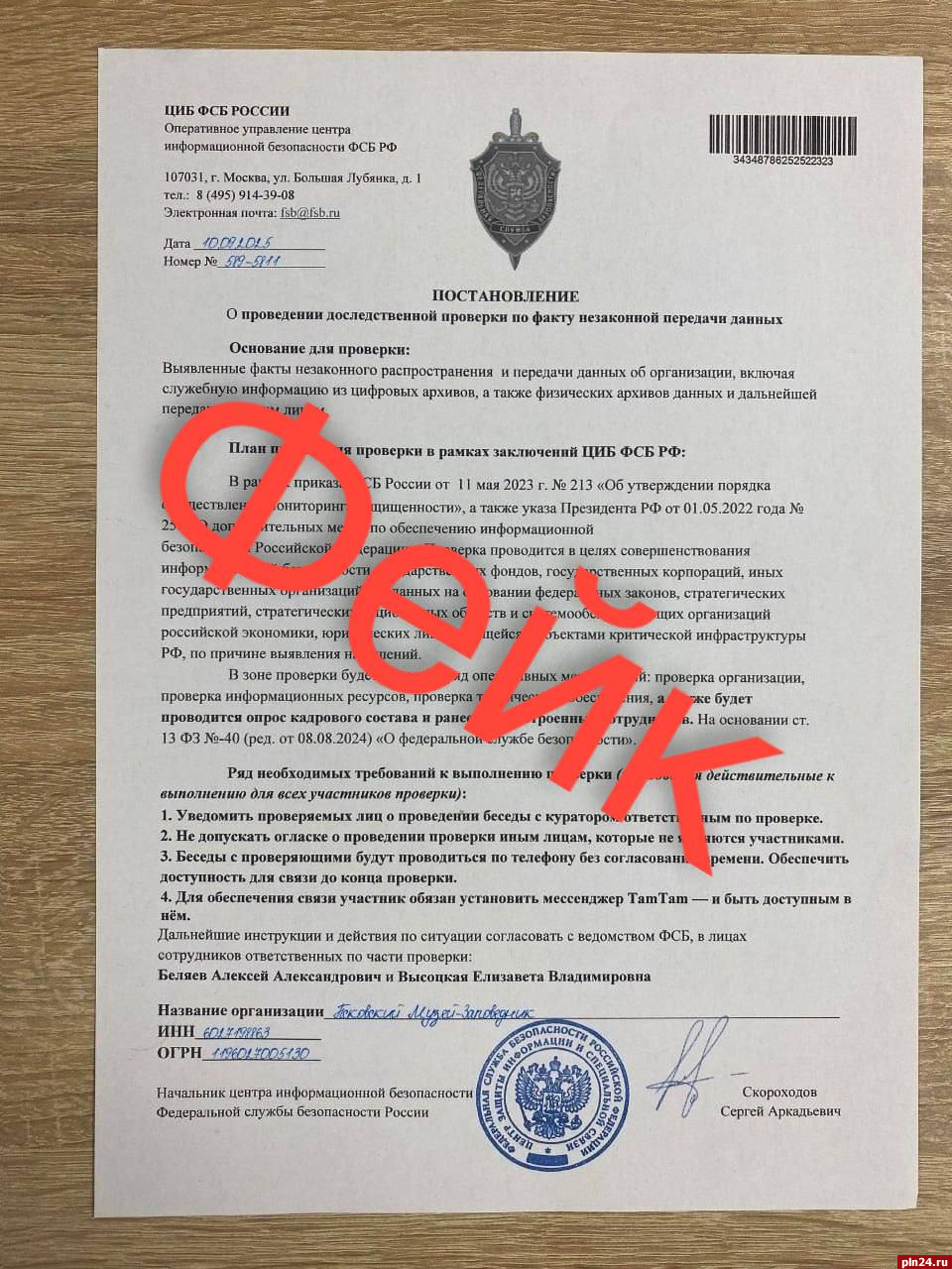 Как стало известно Псковской Ленте Новостей, мошенники прикрепляют фото фейкового документа ФСБ, в котором сообщается о проведении доследственной проверки по факту незаконной передачи данных. В рамках проверки якобы будет проводится опрос кадрового состава и ранее трудоустроенных сотрудников.