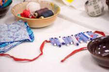 Участники проходят все этапы изготовления аутентичного женского украшения от формирования бусин из ткани, составления уникальной для каждой мастерицы композиции до декорирования готового изделия бисером, пуговицами, кружевом.