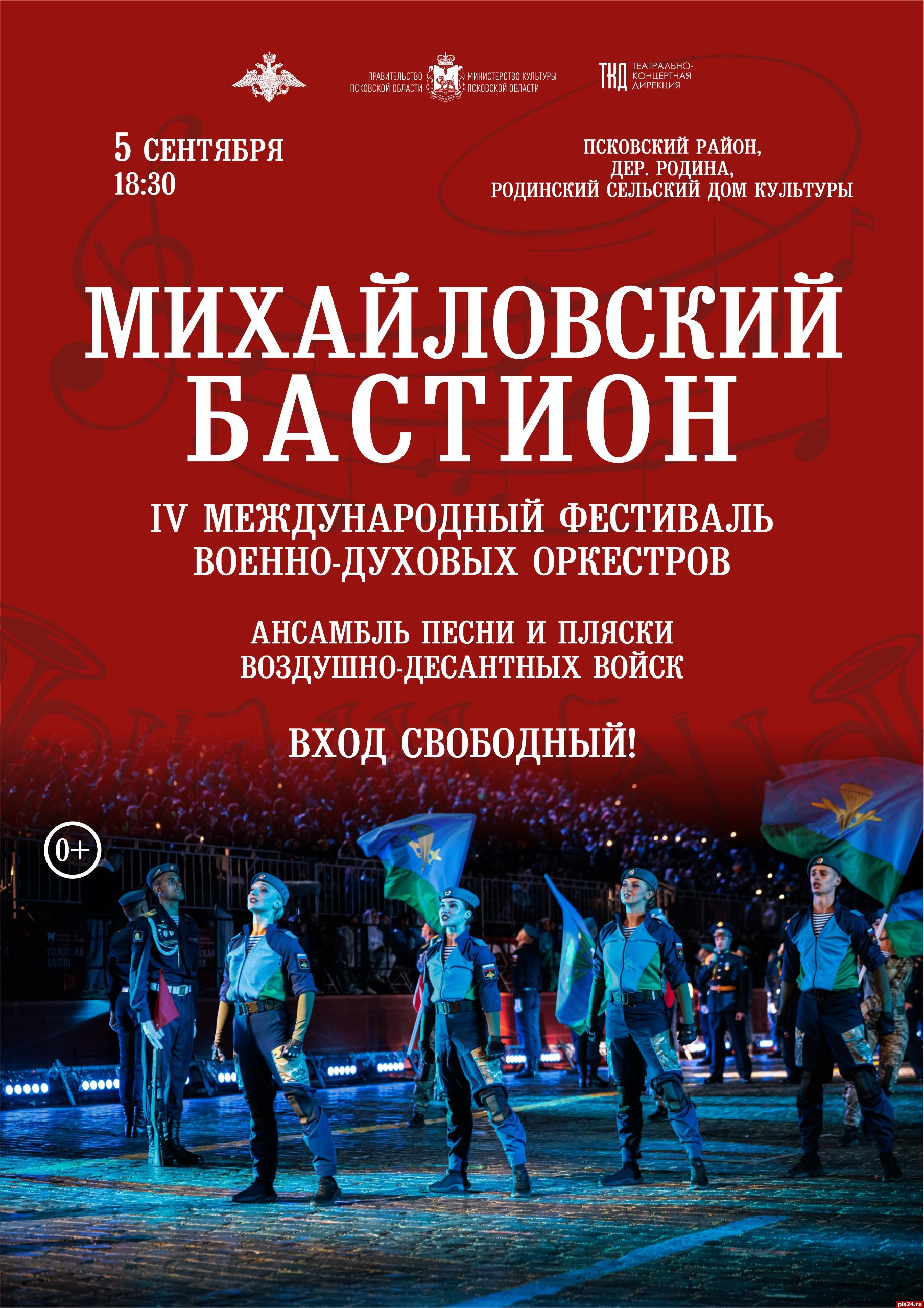5 сентября в рамках военно-музыкального фестиваля духовых оркестров «Михайловский бастион» состоится ряд концертов, охватывающих сразу семь районов Псковской области. Как сообщили Псковской Ленте Новостей в Театрально-концертной дирекции Псковской области, военные оркестры выступят перед жителями и гостями Гдова, Острова, Пушкинских Гор, Себежа, Куньи, Великолукского и Псковского районов.