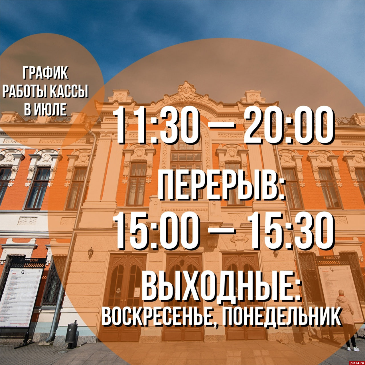 Касса Псковского академического театра драмы имени А. С. Пушкина изменит график работы в июле, сообщили Псковской Ленте Новостей в пресс-службе театра.