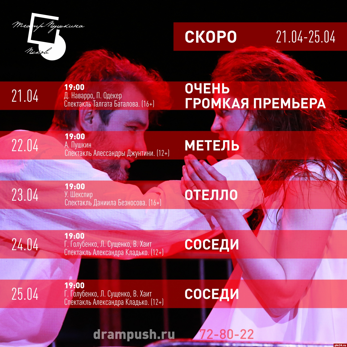 Спектаклями большой формы порадует зрителей Псковский театр драмы на этой неделе. В афише две яркие комедии и один из самых трагических спектаклей мирового репертуара – дерзкая и оглушительная «Очень громкая премьера», светлая лирическая история «Соседи» и шекспировская трагедия «Отелло».