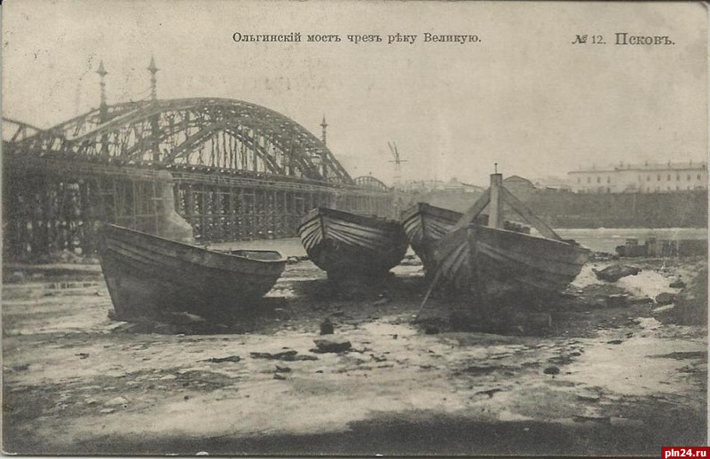 Люди в шинелях, вдали та самая Власьевская часовня. Еще нет Ольгинского моста, кто-то переходит реку по льду. Если приглядеться, то можно увидеть храм Успения с Пароменья. Будто и не менялся за последние сто лет. Чего не скажешь о доме Батова и Анастасьевской часовни, едва виднеющихся с левой стороны.
