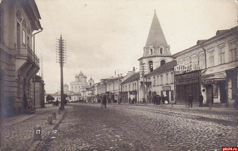 А вот раньше на улице Великолуцкой (кстати, название пошло не от Великих Лук, а от Великой улицы), а ныне Советской, была достаточно плотная малоэтажная застройка. Первые этажи жилых домов занимали всевозможные магазины. На фотографии можно без труда разглядеть вывеску «Обувь».
