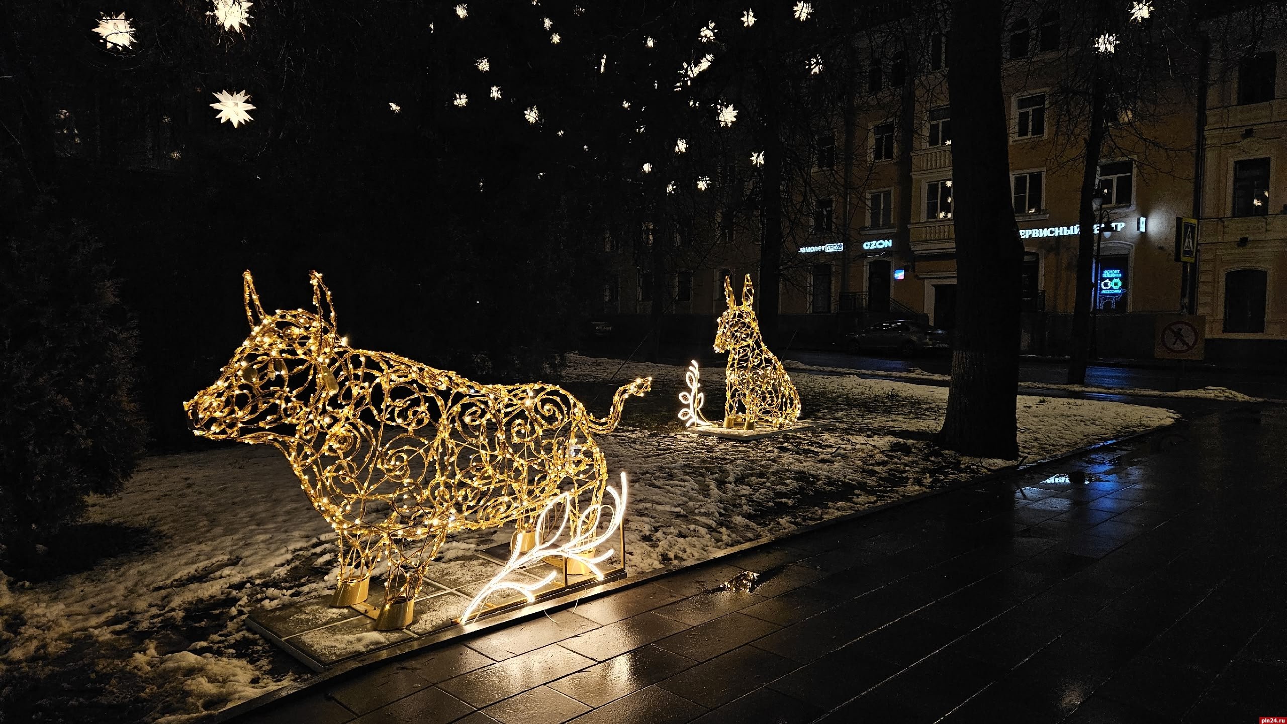 Световые фигуры зверей установили на Октябрьской площади возле здания Главпочтамта, сообщил Псковской Ленте Новостей очевидец.