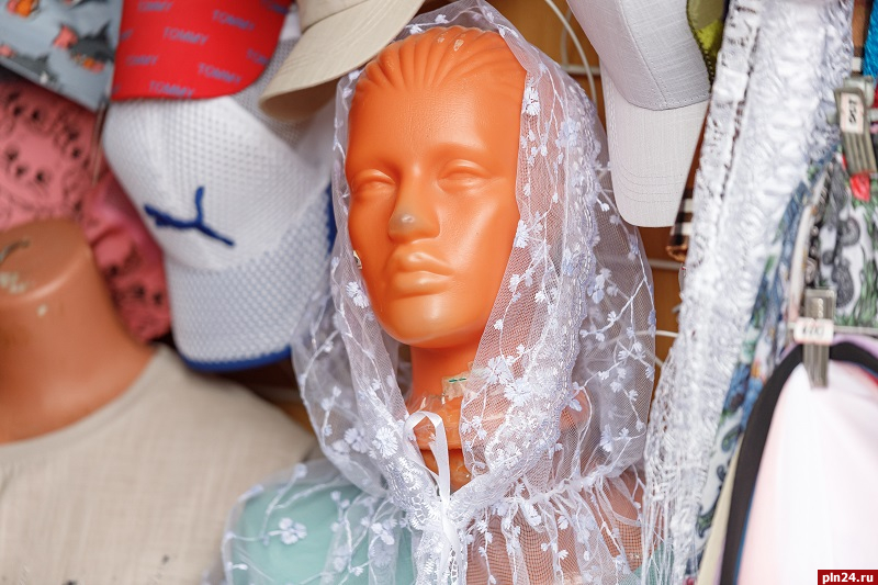 Идем смотреть, что внутри. Самое интересное скрыто в дальнем конце рынка, а пока пробираемся между рядами с одеждой. Полное ощущение перемещения на машине времени. Несмотря на все отстроенные в Пскове за последние двадцать лет торговые центры - на «Ниве» все так же меряют одежду на картонке за шторкой из покрывала. Мешает ли это торговле? Ничуть. Вот Гузеля, торгующая все эти двадцать лет спортивками, футболками и мужскими трусами. Вопрос «Когда лучше шла торговля?» не сразу понимает. Мы-то думали, сейчас начнутся причитания на тему иссякшего потока покупателей. Но Гузеля отвечает, что лучше всего торговля идет весной и летом. Понимаете? Дело исключительно в смене сезонов, а не в смене календарей.
