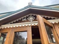 Восстановлены два деревянных остекленных тамбура. Заменены все оконные и дверные заполнения. Отреставрированы кровля, дымники на трубах, купол с золотыми звездами, крест.