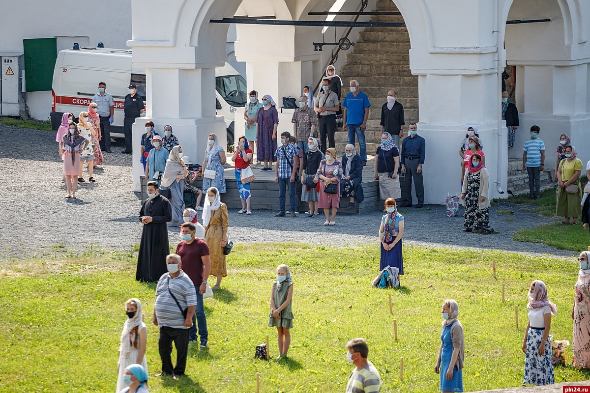 Шум городской жизни вплетается в древние слова молитвы, которые и пятьсот, и тысячу лет назад помогали псковичам. Затихает и замедляется дыхание современной суеты, хотя приметы ее остаются: стоит машина «скорой помощи» рядом с Приказными, полиция предлагает защитные маски и внимательно досматривает гостей, ухо ловит мольбу за врачей и «избавление от губительного поветрия», деревянные колышки обозначают места, которые можно занимать, не нарушая социальной дистанции.