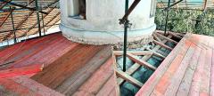 В ходе работ выполнена замена сгнивших балок перекрытий и протезирование отдельных элементов. Полностью проведена замена стропильная система. Монтаж выполнен из деревянного бруса, покрытого антибактериальным и противопожарным средствами защиты.