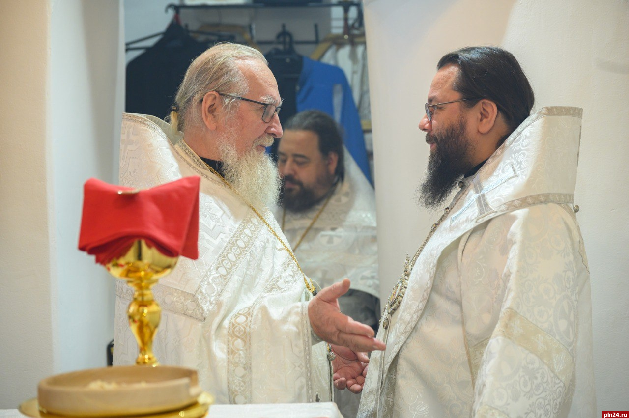 Его Высокопреосвященству сослужили: секретарь Псковского епархиального управления протоиерей Андрей Вахрушев, благочинный монастырей Псковской епархии иеромонах Иннокентий (Селезнев), настоятель Свято-Троицкого кафедрального собора города Пскова иерей Александр Короплясов, настоятель храма Архангела Михаила села Кобылье Городище иеромонах Никандр (Чебурахин).