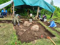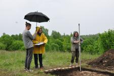 В ходе раскопок, несмотря на дождливую погоду, были заложены три разведывательные траншеи в области, где не сохранились каменные обкладки и плиты. В одной из траншей исследователи обнаружили четыре погребения: одно принадлежало взрослому человеку и находилось под невысокой насыпью, а три других были детскими и располагались в грунтовых ямах. Эти детские захоронения находились в стороне от сохранившихся наземных погребальных конструкций и не имели никаких обозначений на поверхности.