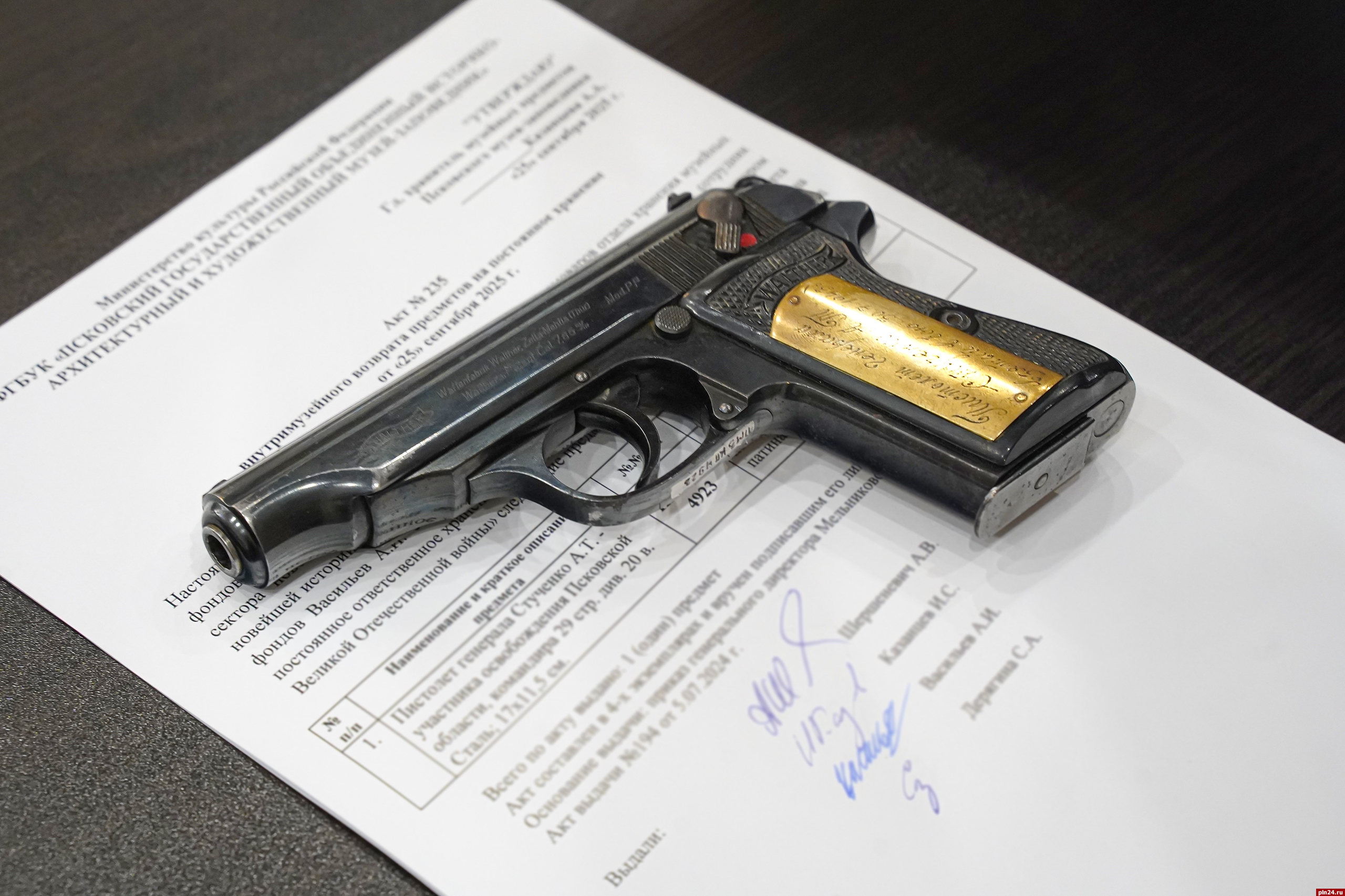 На пистолете Walther PP нанесена гравировка: «Пистолет генерала Стученко А.Т., взятый в бою 30.07.1943 г. Номер пистолета 969877».