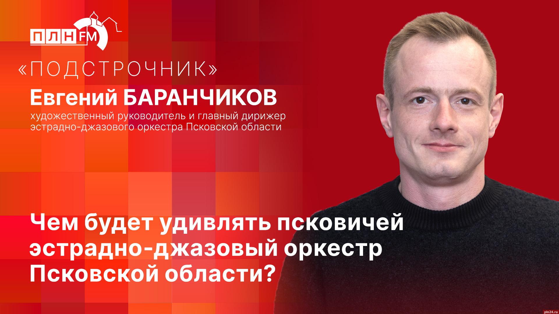 Слушайте в эфире радио «ПЛН FM» (102.6 FM) новый выпуск программы «Подстрочник». Гость студии - художественный руководитель и главный дирижер эстрадно-джазового оркестра Псковской области Евгений Баранчиков.