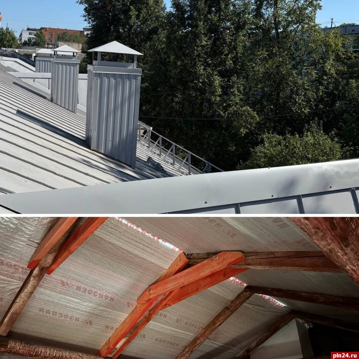 Произведен монтаж кровельного покрытия из оцинкованного профилированного листа с полимерным покрытием, установлены элементы безопасности крыши, выполнено устройство водосточной системы. Выполнен ремонт вентиляционных труб и каналов, устройство слуховых окон, установлены колпаки и решетки.