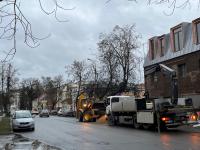 Гора песка мешают проезду на улице Советской в Пскове, напротив Первой музыкальной школы.