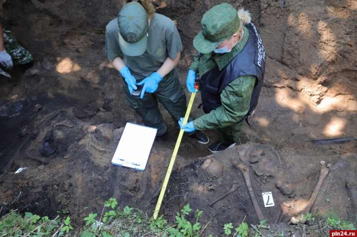 Прибывшие на место раскопок сотрудники следственного комитета России эксгумировали останки людей для проведения экспертизы.