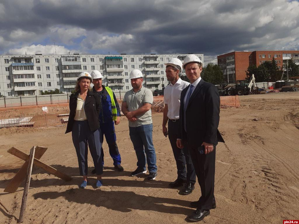 Самую большую строительную площадку в районном центре во время рабочей поездки посетили Владимир Кузь и врио председателя комитета по образованию Псковской области Андрей Ермаков.