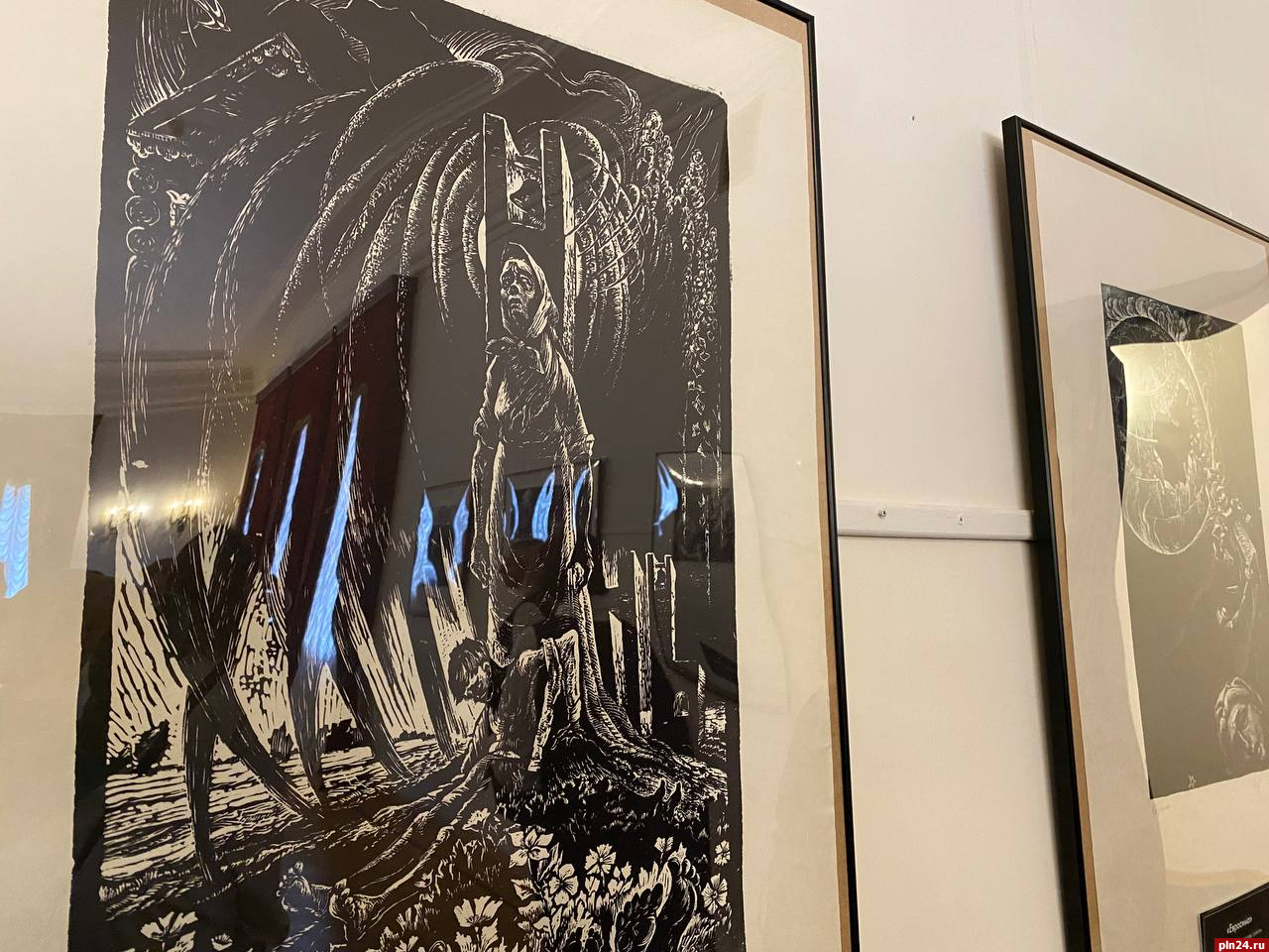 Выставку «На земле, опалённой войной» дополнила графика самодеятельного художника Игнатия Чапкина, более 100 работ которого сегодня хранятся в Литературно-художественном музее имени писателя И. Васильева в деревне Борки Великолукского района. В прошлом году директор учреждения Ольга Андреевская откликнулась на предложение поучаствовать в выставке «Ковалевская и космос» в Полибино, а на этот раз предоставила 16 линогравюр не тему Великой Отечественной войны.
