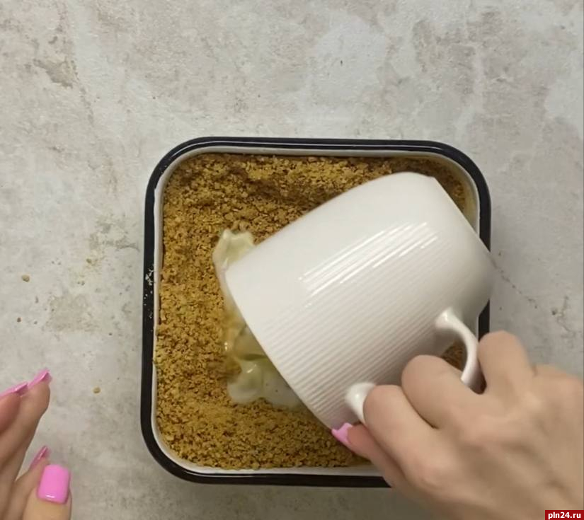 Печенье измельчаем в крошку и добавляем к нему растопленное сливочное масло. Перемешиваем руками и распределяем стаканом по форме. Когда основа готова, отправляем форму в морозилку на 10 минут.