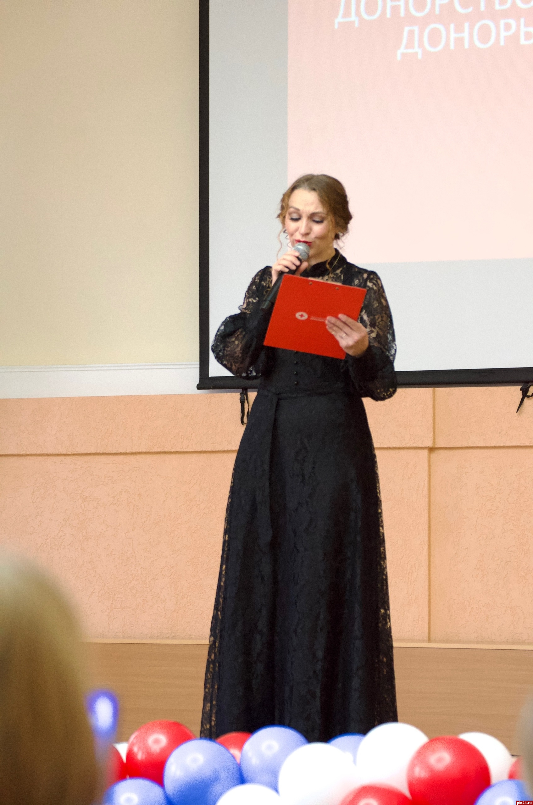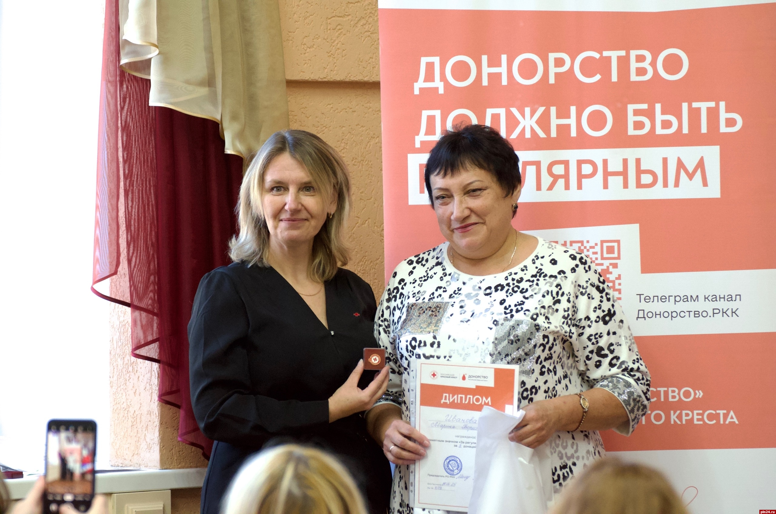 Председатель Псковского регионального отделения Российского Красного Креста Валерия Мишакова выступила с приветственным словом и отметила, что подобные значки выдаются в регионе впервые. Она подчеркнула: «В этом году Российский Красный Крест изготовил памятные значки. Они выдаются женщинам, кто сдал цельную кровь 8 раз за последние два года, либо 15 раз ее компоненты. У мужчин 10 и 20 донаций соответственно. На такие значки у нас в регионе претендуют более 100 человек».