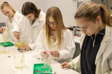 Ребят разделили на две команды по разным направлениям. Первая группа отправилась в нано-лабораторию. Там ребята сменили повседневную одежду на халаты исследователей, своими глазами увидели химические и физические опыты и поучаствовали в их проведении.
