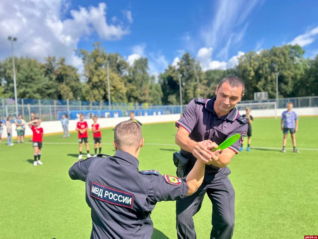 Зарядку для собравшихся провела специалист по направлению профессиональной подготовки группы по работе с личным составом МО МВД России «Великолукский» майор полиции Ирина Моисеева. После разминки старший участковый уполномоченный ОМВД России по г.Великие Луки капитан полиции Андрей Виноградов и старший инспектор отделения по делам миграции ОВМ ОМВД России по г. Великие Луки старший лейтенант полиции Евгений Гаврилов показали собравшимся боевые приемы борьбы.