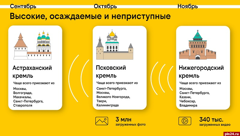 Между тем, в Псковском кремле, подвергавшемся нападениям более 30 раз и вошедшем в историю как самый осаждаемый среди всех, пик потребления трафика приходится на октябрь (более 3 ТБ*).