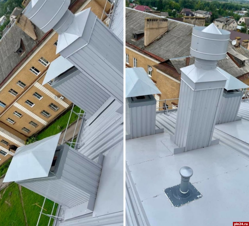 Произведен монтаж кровельного покрытия из оцинкованного профилированного листа с полимерным покрытием, установлены элементы безопасности крыши, выполнено устройство водосточной системы. Выполнен ремонт вентиляционных труб и каналов, устройство слуховых окон, установлены колпаки и решетки.